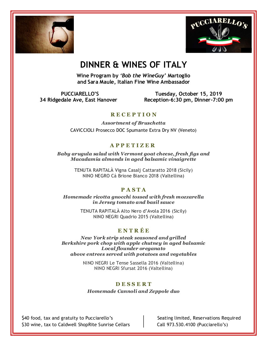 Wine Dinner Pucciarello’s 24 Saturday Aug 2019 Posted by BobtheWineGuy in Other ≈ Leave a comment Click this link for Pucciarello’s 40.820062 -74.364725 East Hanover, NJ, USA Share this: Click to email a link to a friend (Opens in new window) Email Click to share on Facebook (Opens in new window) Facebook Like Loading...